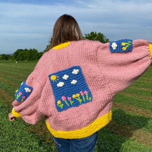 Handmade Pink Knit Cardigan, Cloud Sun Flowers, Boho Sweater